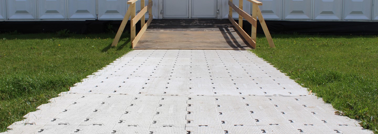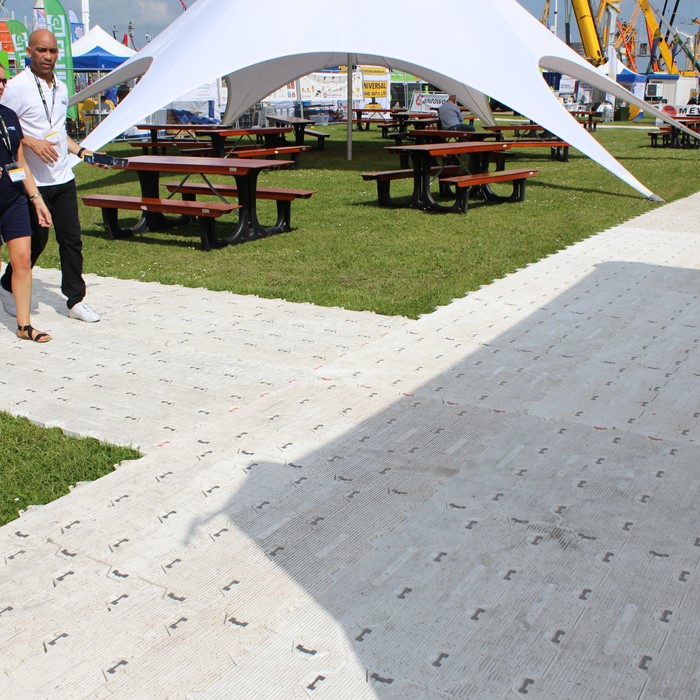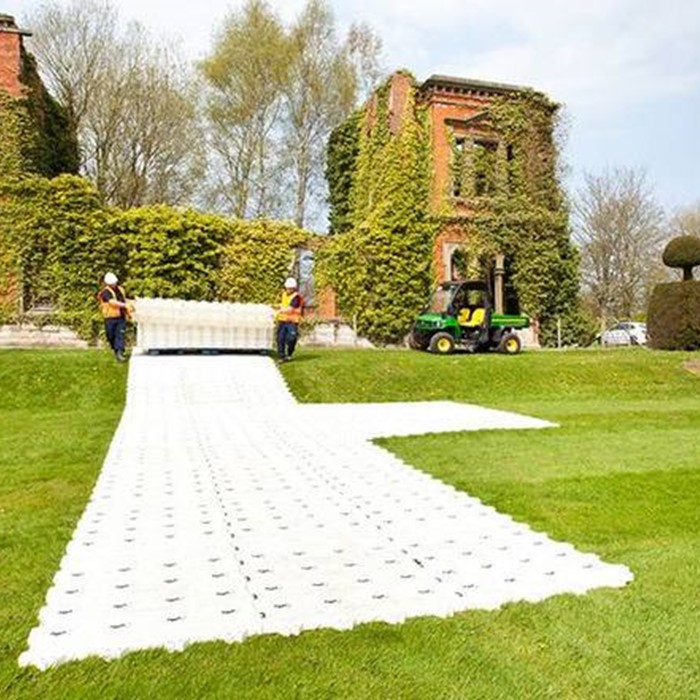 Supa-trac ist ein für Fußgänger geeignetes temporäres Wegebau- und Rasenschutzabdeckungssystem aus Kunststoff.